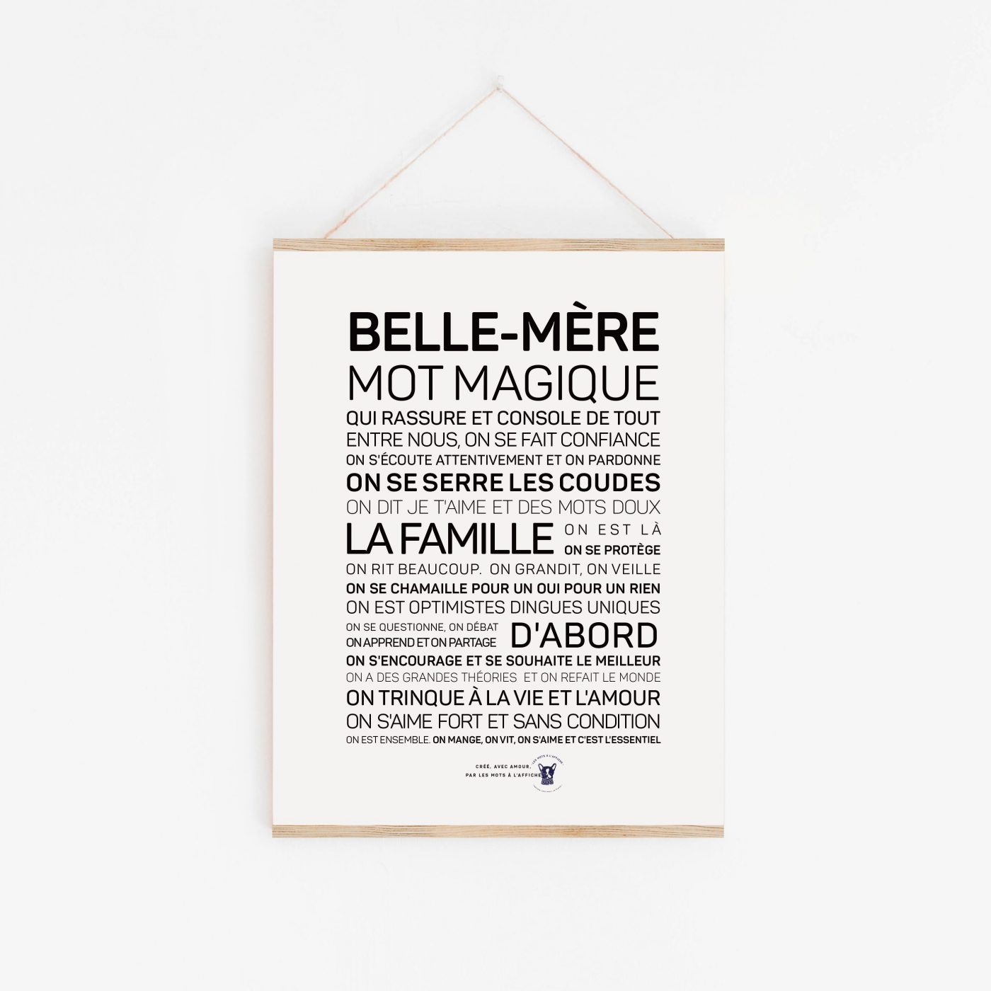 L’affiche « Belle-mère, mot magique » est une célébration tendre et sincère de toutes les belles-mères extraordinaires qui rendent notre quotidien plus riche. Pensée comme un message d’amour et de reconnaissance, elle exprime « je t’aime » et « merci d’être là ».