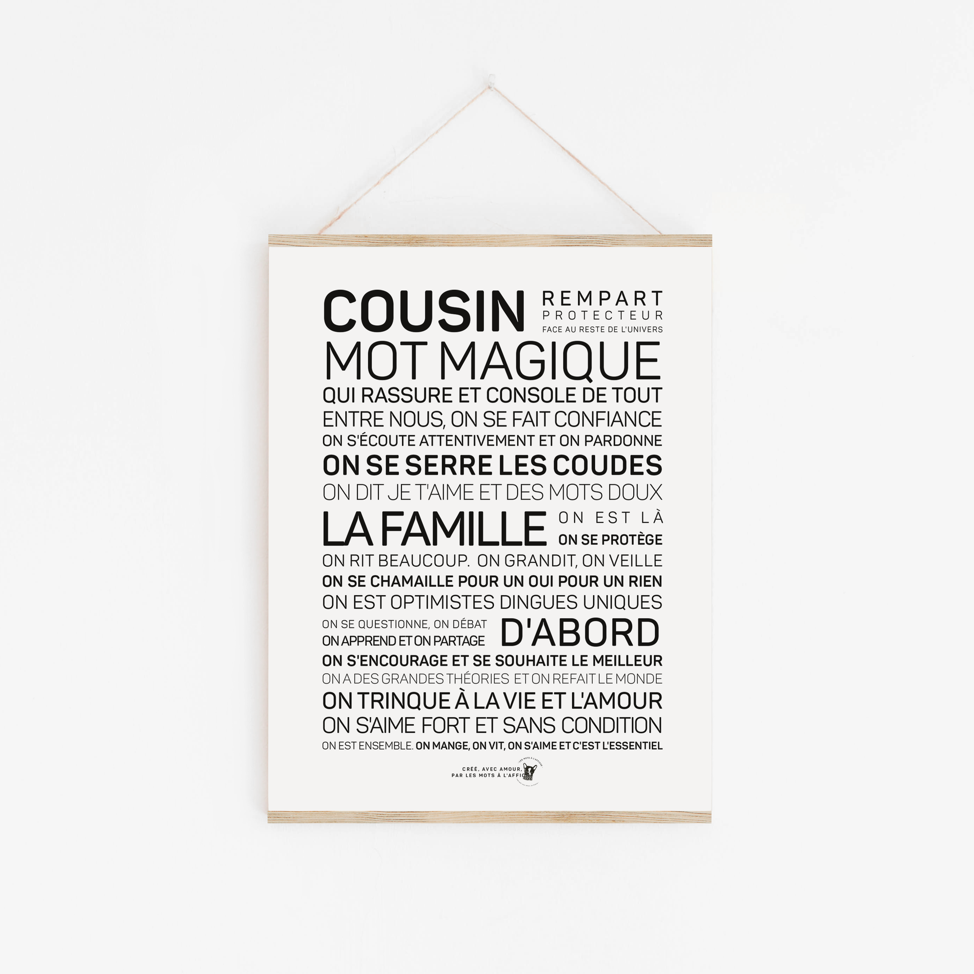 Une affiche parfaite pour offrir à un cousin pour un anniversaire, une pendaison de crémaillère, ou simplement pour lui rappeler combien il est précieux. Encadrée ou suspendue, elle trouve sa place dans un espace qui lui est dédié.