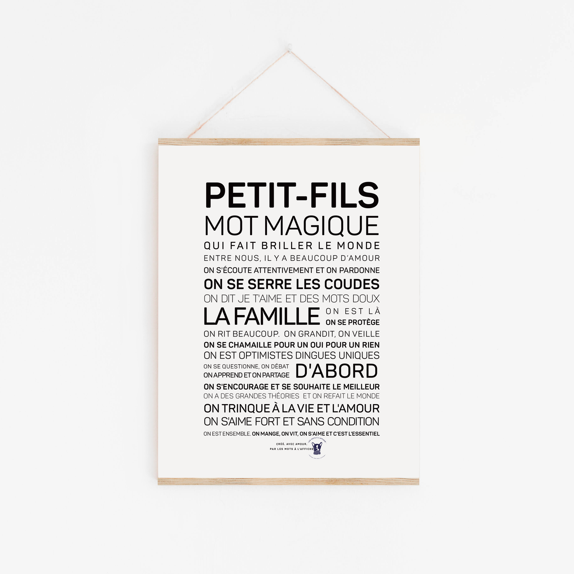 « Petit-fils, mot magique ». Une affiche pour lui dire « je t’aime », « merci d’exister », et rappeler que votre lien est unique, fort et précieux. Créée par Les mots à l’affiche, elle s’inscrit dans une démarche artisanale et poétique.