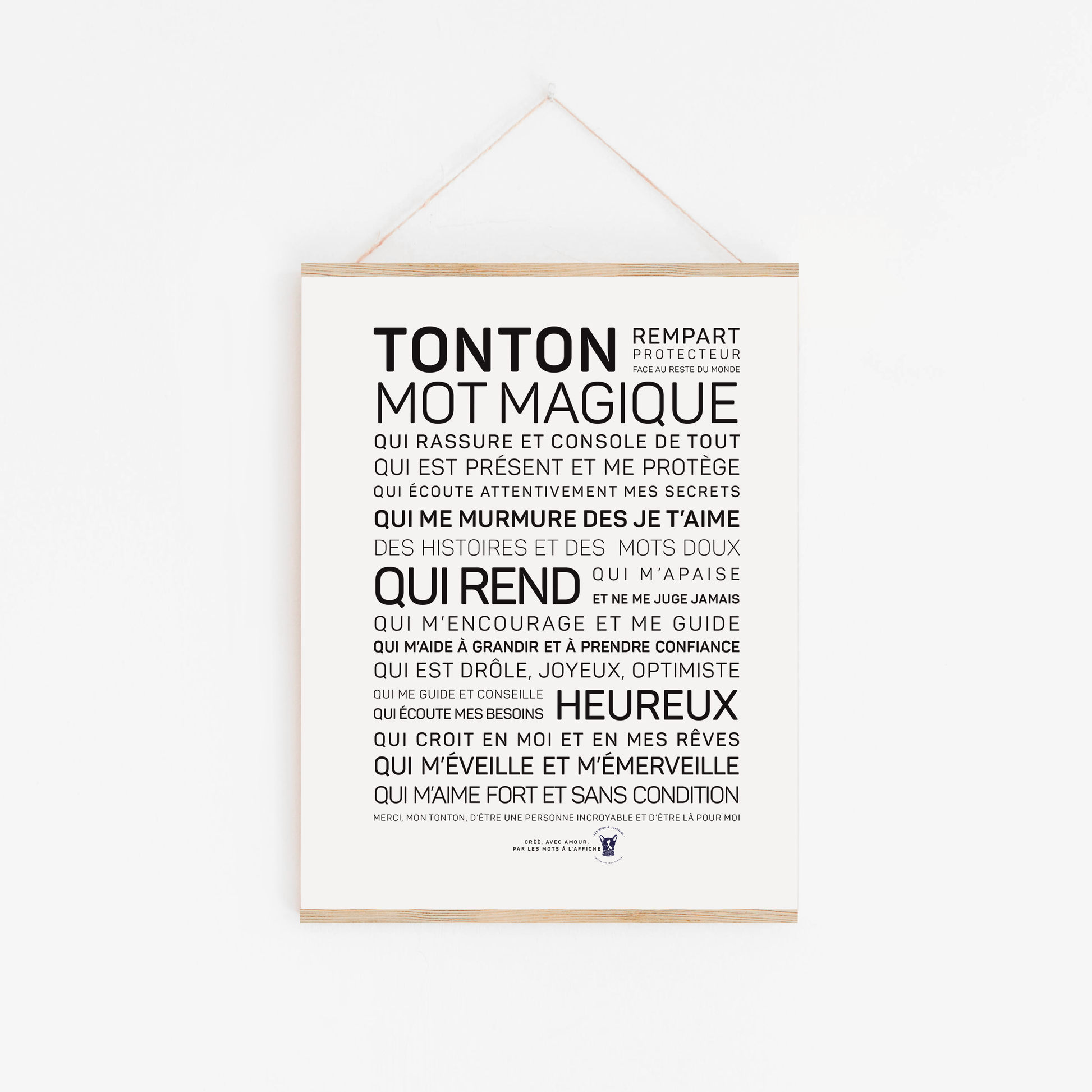 L’affiche « Tonton, mot magique » célèbre avec tendresse tous les oncles extraordinaires qui enrichissent notre vie. Créée par Les mots à l’affiche, elle exprime : « merci d’être là », « je t’aime » et « tu comptes pour moi ».