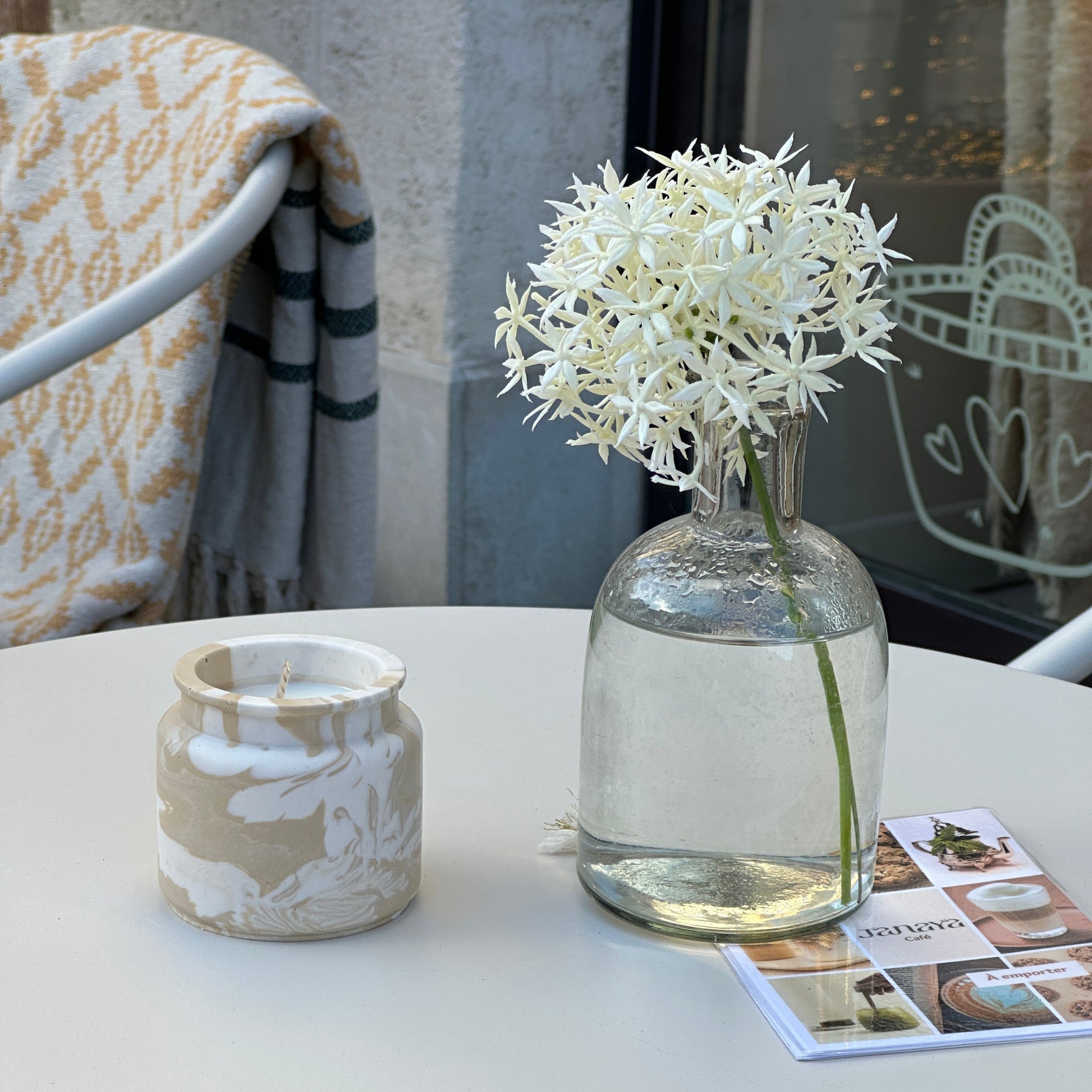 La bougie en Jesmonite bejjmat est un produit artisanal confectionné à la main avec des matériaux haut de gamme. Le contenant en Jesmonite est fabriqué en mélangeant une poudre minérale à un liant, permettant ainsi une matière solide et durable pouvant être modelée pour obtenir des formes uniques et fascinantes.