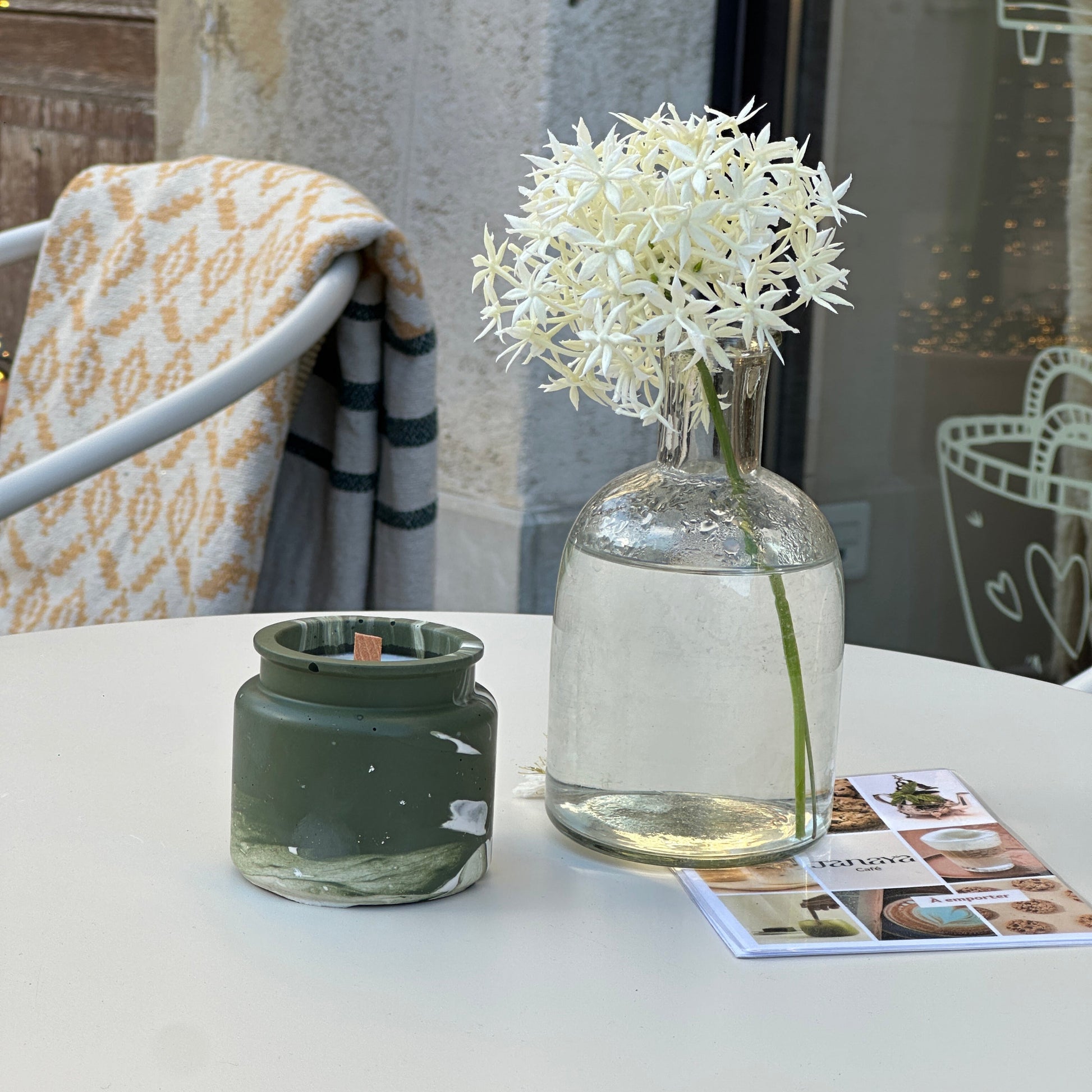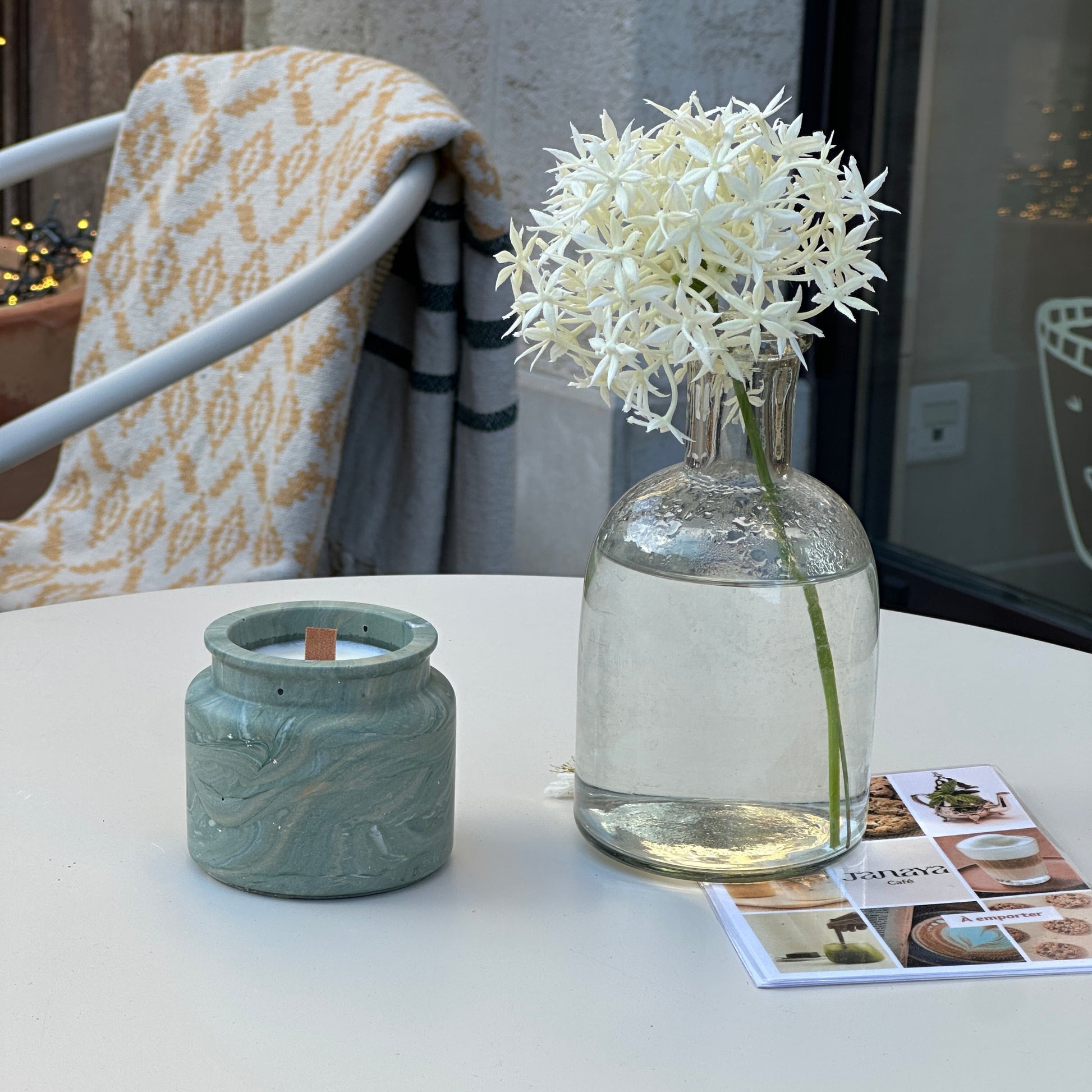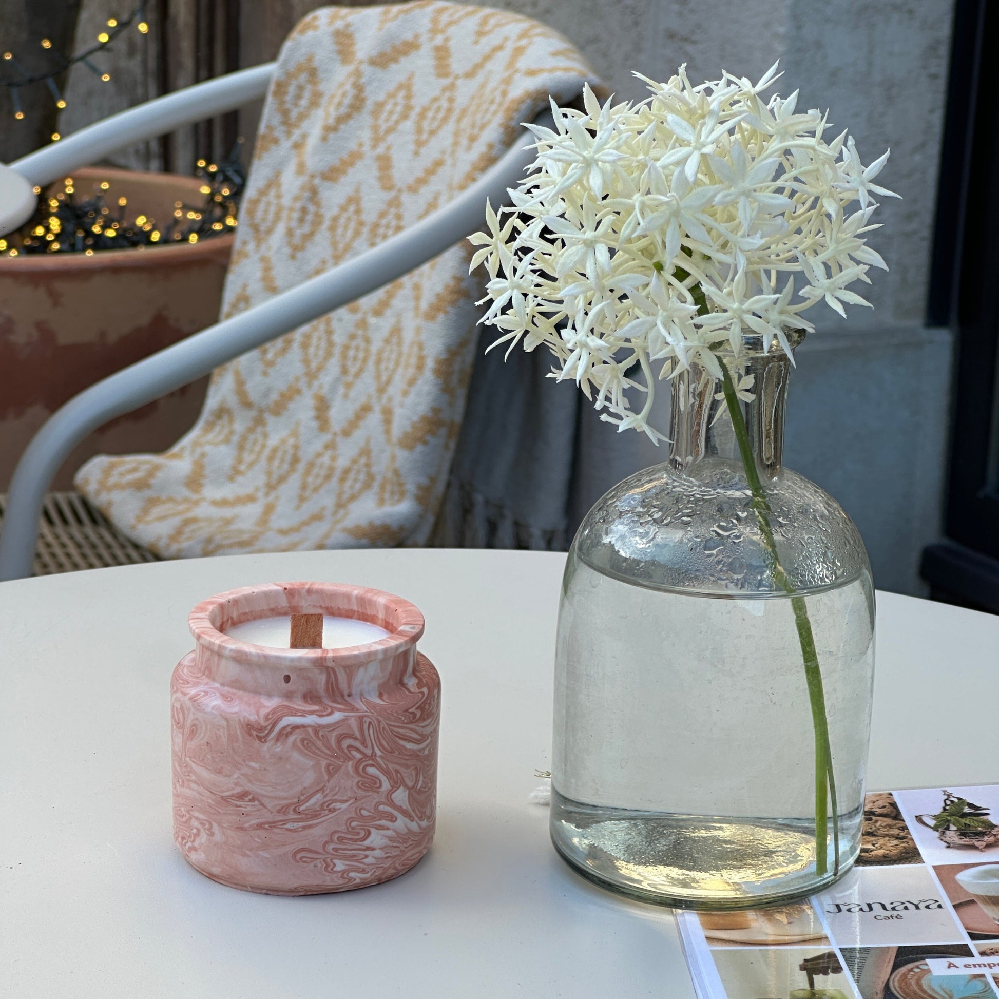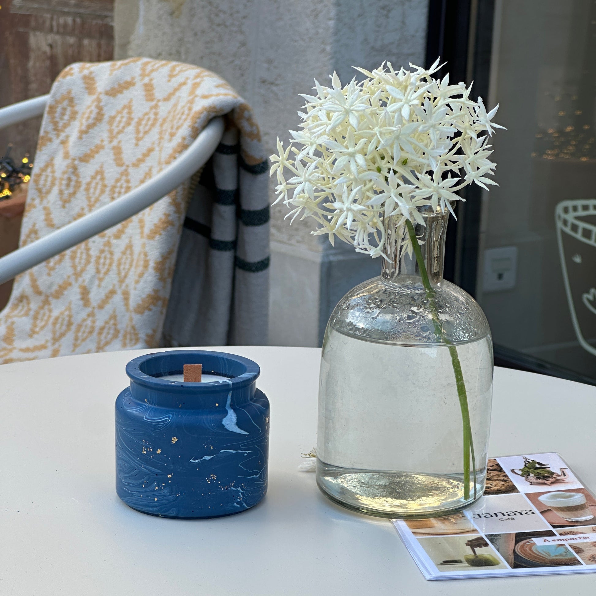 Chaque contenant de bougie est unique, avec des variations de couleur et de forme en fonction du pigment Jesmonite utilisé. Cette bougie est un ajout élégant à tout décor intérieur et offre une combustion respectueuse de l'environnement tout en diffusant un parfum naturellement agréable.