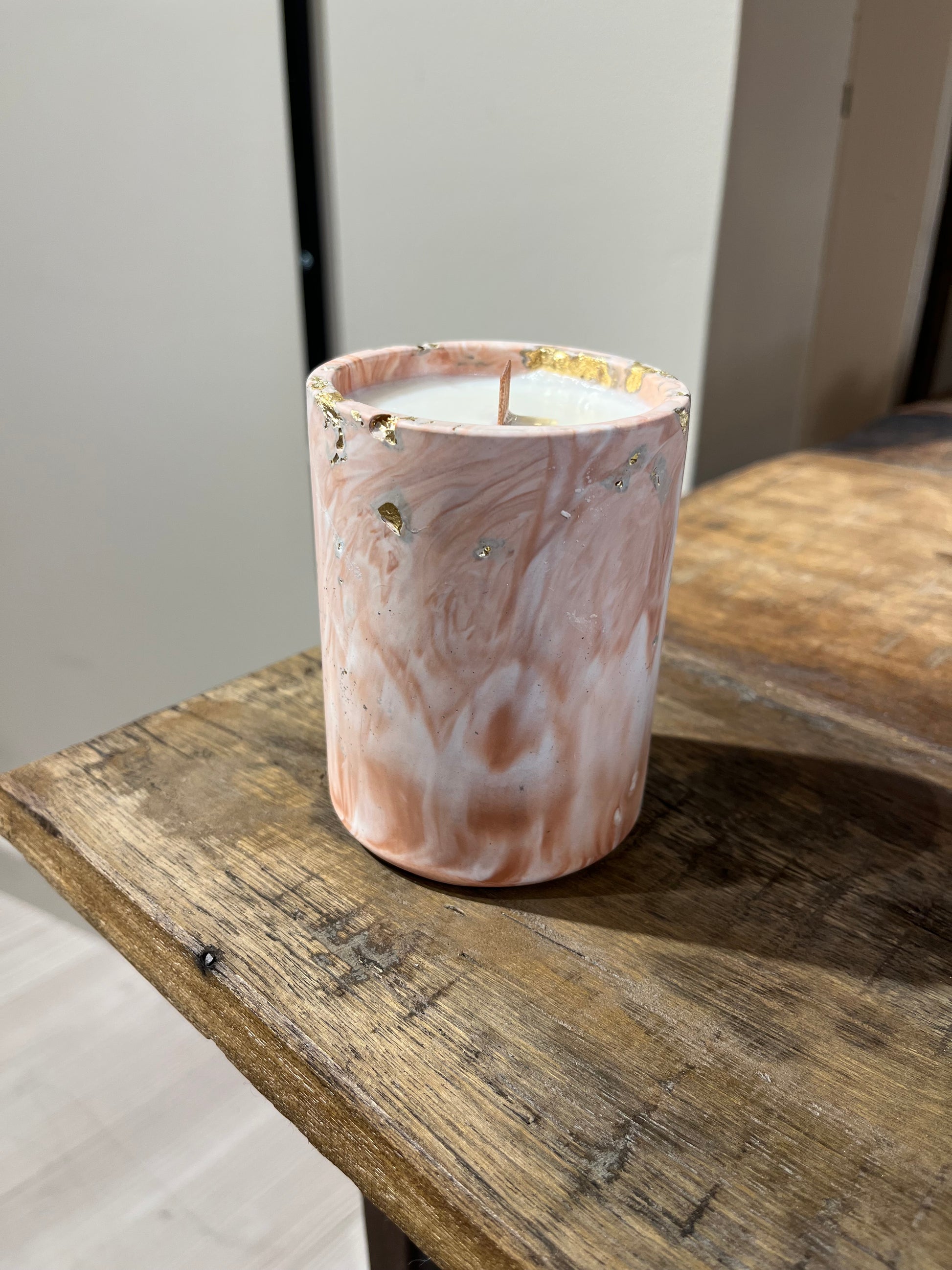 Chaque contenant de bougie est unique, avec des variations de couleur et de forme en fonction du pigment Jesmonite utilisé. Cette bougie est un ajout élégant à tout décor intérieur et offre une combustion respectueuse de l'environnement tout en diffusant un parfum naturellement agréable.