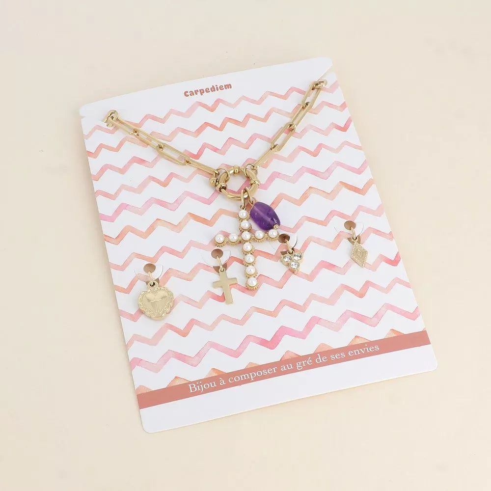 Le collier Carpe Diem célèbre la spiritualité et la symbolique des bijoux anciens. Sa maille dorée accueille une grande croix ornée de perles blanches, une pierre d'améthyste et plusieurs charms à composer – cœur sacré, croix fine, losange gravé et strass lumineux. Présenté sur carte cadeau, il invite à créer un bijou personnalisé chargé de sens.
