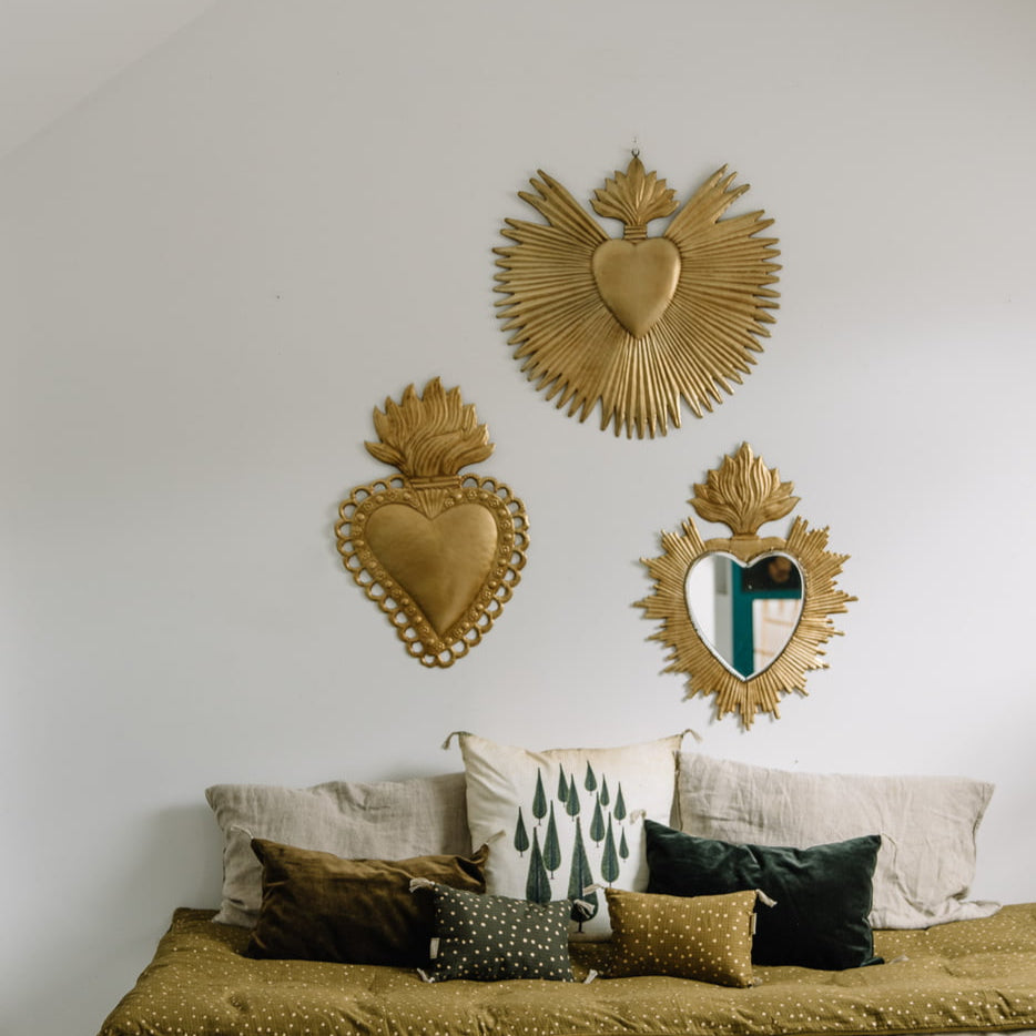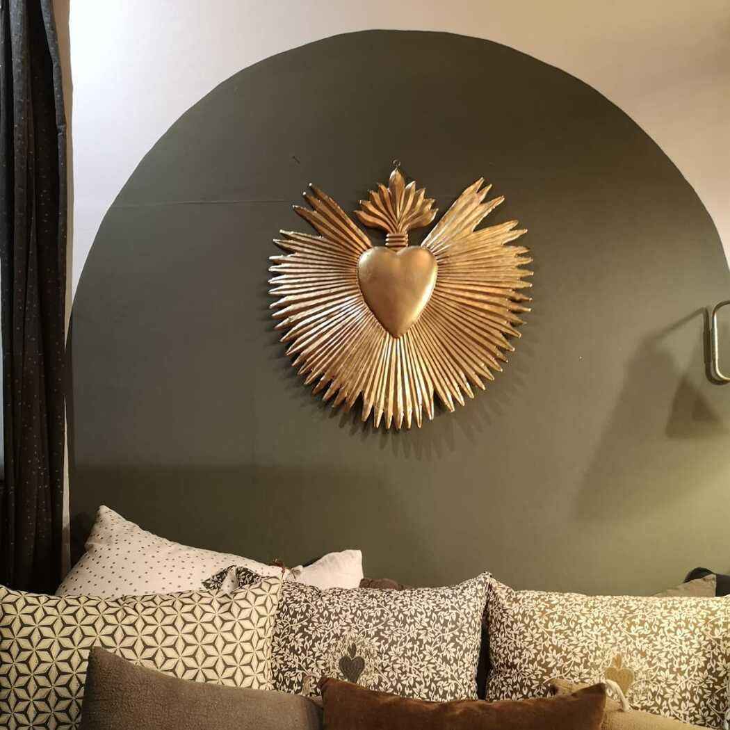 Découvrez la majesté du Coeur Impérial Or, un grand ex-voto mural d'une élégance incomparable. Inspiré par la tradition des églises, cet objet symbolique, autrefois suspendu dans des lieux vénérés, évoque la réalisation de vœux ou la gratitude pour une grâce obtenue. Imposant avec ses dimensions de 60 x 60 cm, ce coeur impérial en fer blanc patiné à la main incarne l'artisanat indien avec ses légères variations de formes et de patines.