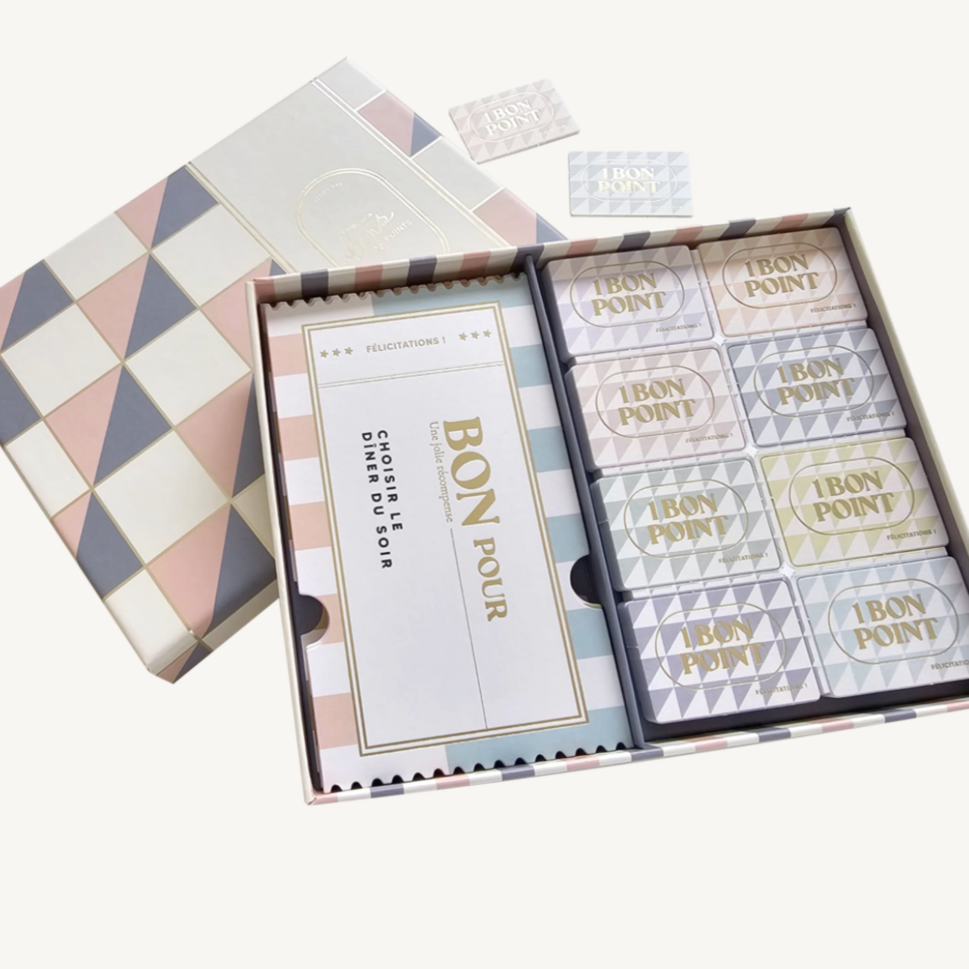 Encouragez les enfants au quotidien en valorisant leurs efforts, leurs bonnes actions et leurs progrès grâce à un système simple de bons points à collectionner et de cartes récompenses à débloquer.