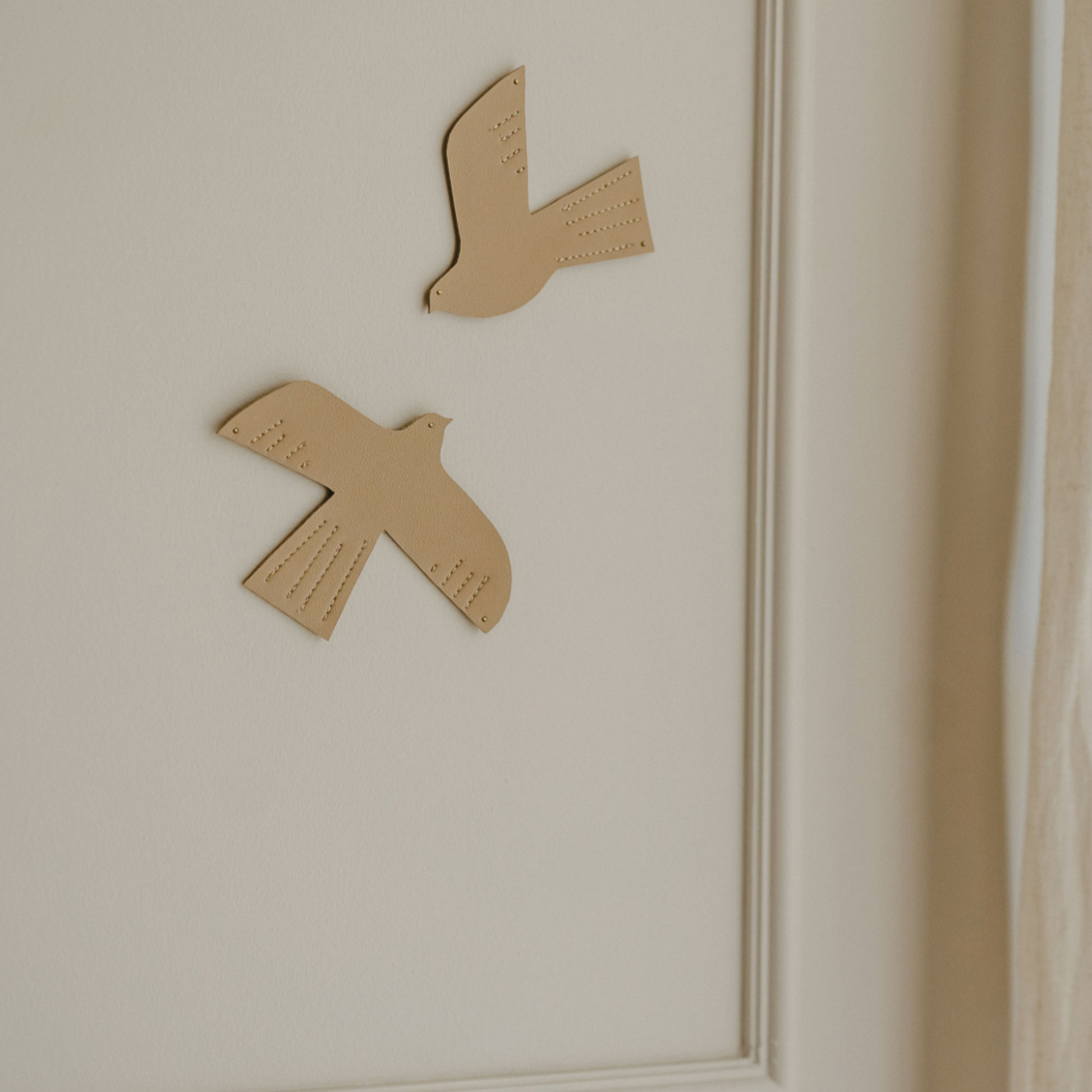 Un oiseau décoratif en cuir qui apporte une touche de poésie et de modernité à votre intérieur. Ses lignes délicates et ses détails cousus en font un objet unique, à la fois discret et raffiné. Idéal pour habiller le mur d’une chambre de bébé, d’un bureau ou de toute autre pièce de la maison, il se fixe facilement grâce aux trois clous dorés fournis et peut être orienté selon vos envies.