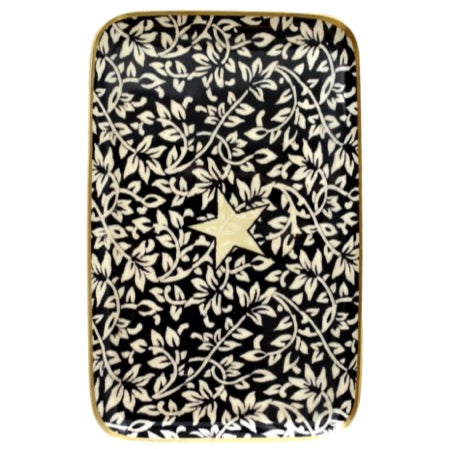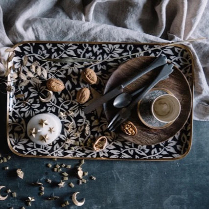 Le Plateau Rameau Carbone, au design rectangulaire émaillé, offre une élégance polyvalente pour le service ou la décoration, orné de motifs inspirés des "block print" indiens. Fabriqué à 100 % en aluminium émaillé, avec une finition de bordure dorée réalisée à la main, chaque plateau est unique avec des variations subtiles de formes et de couleurs, témoignant de sa fabrication artisanale.