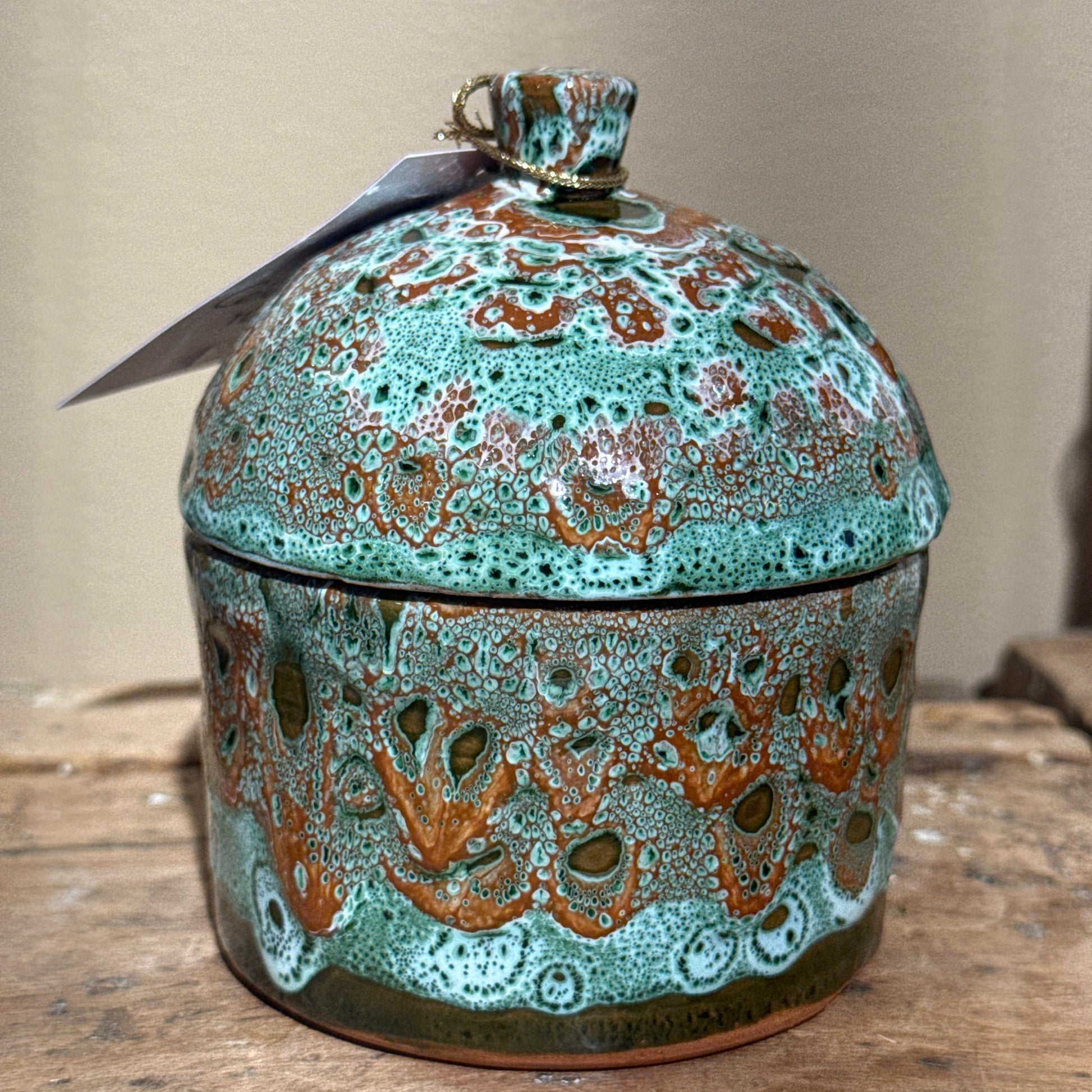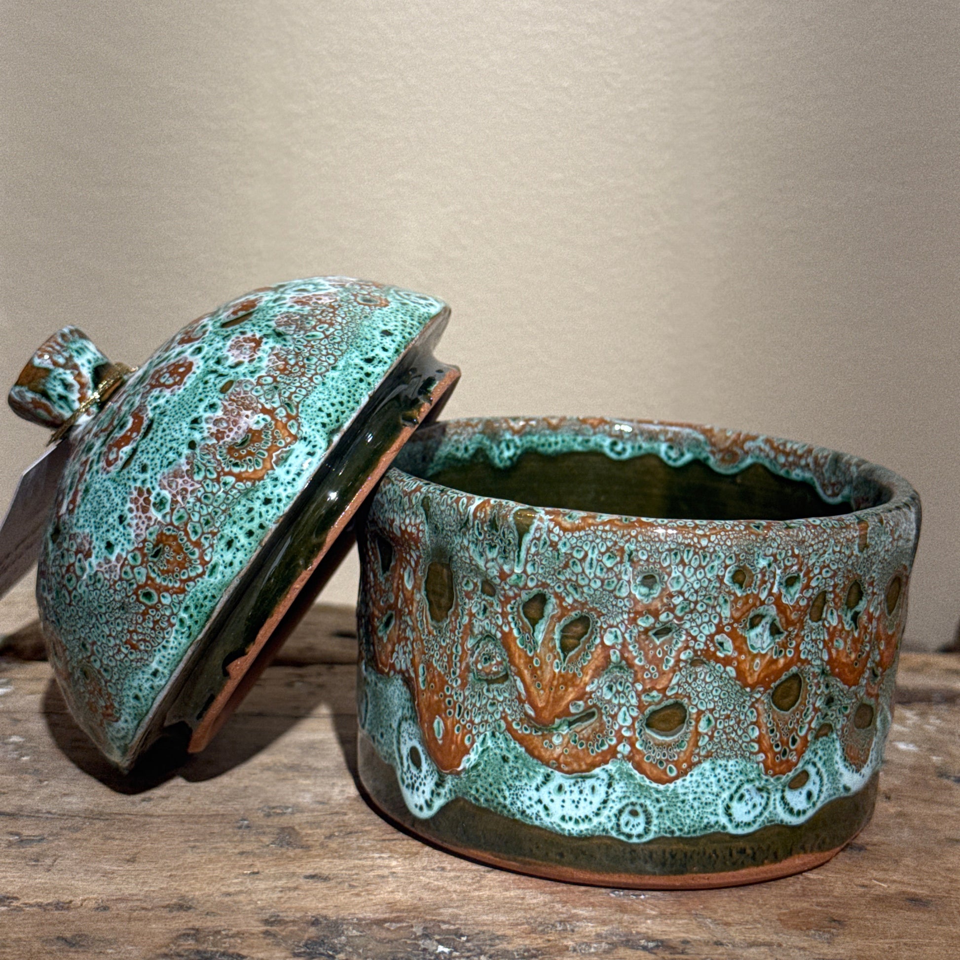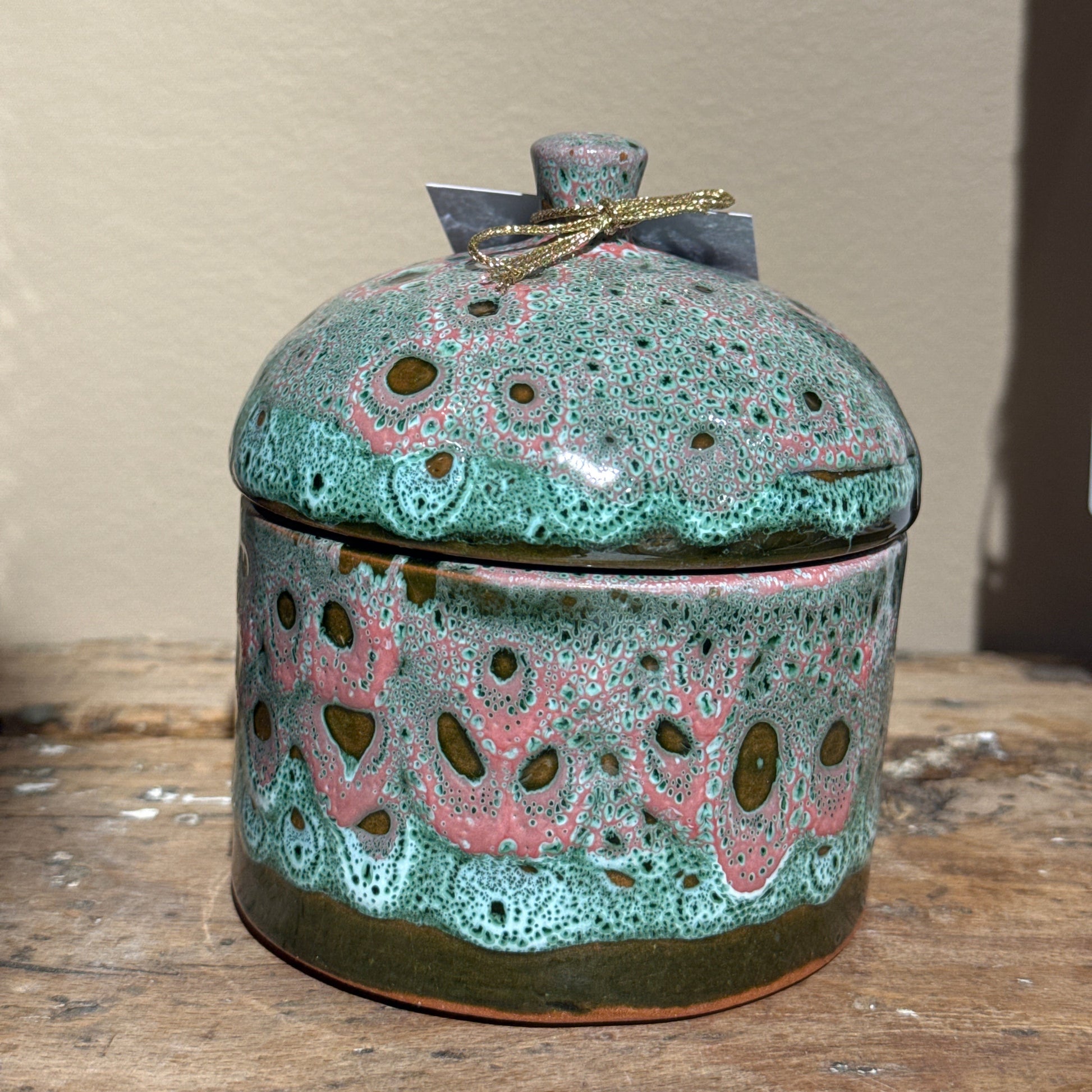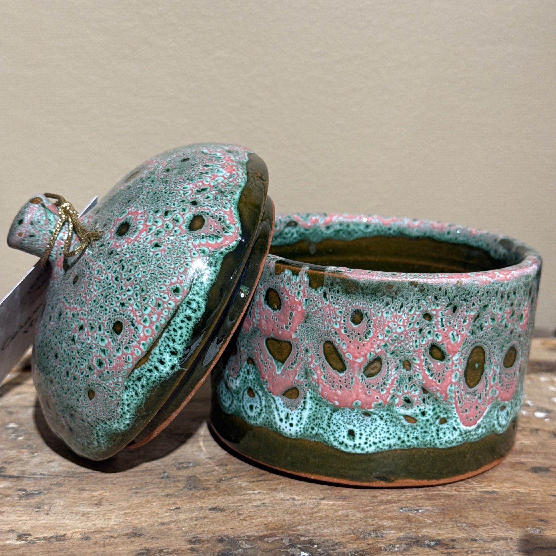 Pot en céramique avec couvercle – Émail texturé vert et rose