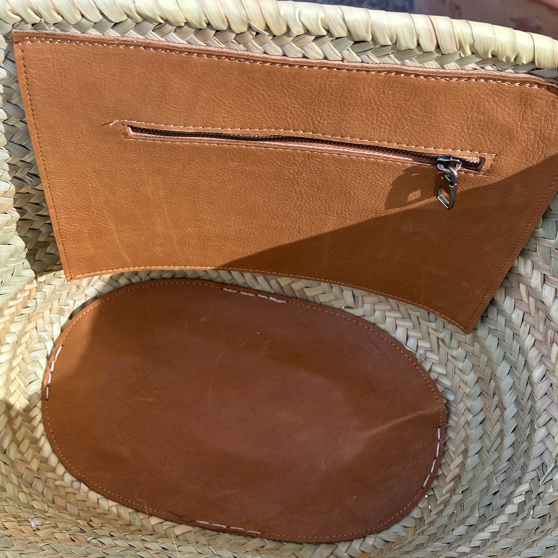 À l’extérieur, une poche en cuir suédé (daim) habillée de franges délicates apporte caractère et modernité. Le fond en cuir renforce la solidité du panier tout en sublimant son allure.