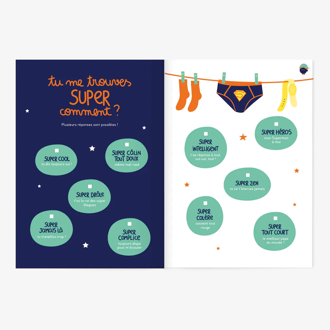 Entre père et fils, vous vous adorez, vous vous chamaillez, vous vous faites la tête, puis vous vous faites un check ! Avec un brin d'humour, un peu de sensibilité et beaucoup de légèreté, ce livre vous propose d'explorer ce qui vous lie, vous ressemble ou vous oppose. Au programme : des jeux et des activités pensées pour de vrais moments de complicité entre garçons !